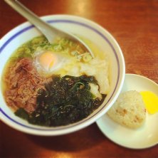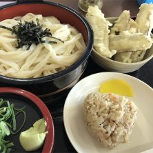 雨で体が冷えてここまで我慢してお腹ヘッタ〜。「温野菜天ぶっかけ[680えん]」。頼んでから揚げてくれる天ぷらがサクサクで美味しいっ!