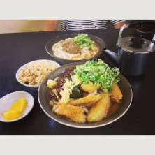 *お子様セット* 今日の昼食☆ 小さい頃から通ってます 麺が普通サイズより少なく、かしわご飯付いてくるお子様セット! 具いっぱい♪ この店、こしがないうどんなのです! 実は私はこしなしうどん派♪