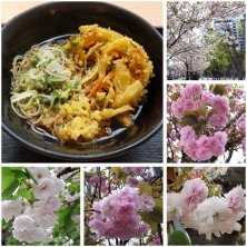 本日のランチ かきあげ蕎麦 570円 (あげ玉+胡麻 増し) このお店の前の通りは八重桜の並木で、 この時期は🌸を見ながら食べられる😋 モフモフしてて可愛らしい。 それにしても咲く→満開が早い!
