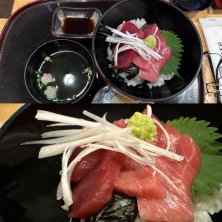 雷神そば。 鮪の山かけと小エビの天ぷらを乗せた冷やしぶっかけそば。ワカメ、わけぎなどトッピングも豊富な一品。ツルツル入るので食欲減退の時など持ってこいだね