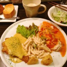日替りランチ お肉とお魚料理がワンプレートでいただける、欲張りさんご用達メニュー。(笑) 蒸し鶏のようなお肉料理にはガーリックチップが一杯乗ってた。 これから人と会うのに大丈夫か、私。( ;´Д`) お魚料理はカレーソースのムニエルでした。