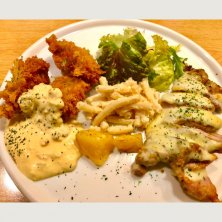 日替わりランチ: カキフライ、チキンのカレーチーズ焼き 土曜、大仙公園行く前のランチ。調べずに適当に入ったお店は大当たりでした♪ パンorライス、サラダ、スープが付いてました。