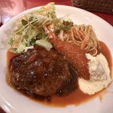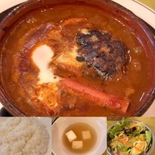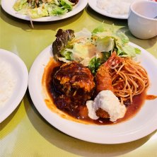 今日のランチ 神戸 三ノ宮のビストロ マルタン 煮込みハンバーグランチ デミグラスソースハンバーグと舌平目のフライ ランチ 煮込みハンバーグが柔らかく美味しく、ソースもこがし玉ねぎと十数種類のスパイスを効かせたマサラソースで美味しかった