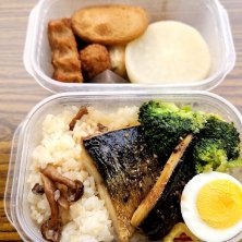 本日のお弁当 昨夜の仕込んだおでんも食べたくて。 前回のおでんの大根が柔らかすぎたので、今回は固めに下茹でしたら、硬すぎました。なんども煮てったら柔らかくなるかな。 鯖はエスニックなスパイスたちを振りかけて、レンチン焼きです。 レンチン楽ですわー。 レンジが鯖の匂いしちゃうけど。