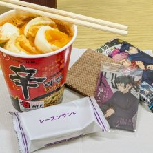こんばんは 夜勤の休憩時間です 疲れた…今夜は辛ラーメン、手作りゆで卵、呪術廻戦ウェハース6の42日目 今回のウェハースは真希さん(2枚目) セブンのレーズンサンドは朝小腹減った時に食べるおやつ 明けに丸ビルのイベント行こうと思ってたけど、開店前から相当並ばないとコラボ飲食店入れないみたいだから諦めた 今日は別の寄り道しよう