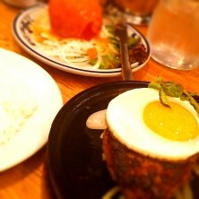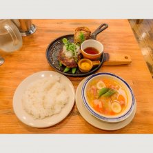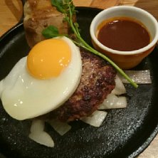 ランチに、ジャーマンハンブルグステーキ♪ 厚めのハンバーグの上に半熟ゆで卵・ジャガイモが丸一個・ハンバーグの下には玉ねぎ。 肉質も安定感あるしボリューム満点(^^)