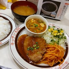 生姜焼きとメンチカツの定食 分厚いロース肉に甘めのジンジャーソースがタマランチ会長。田村でも谷でも金メダルですわ。 「キッチンABC」「キッチン南海」「洋包丁」ここら辺の老舗洋食チェーンはどこもリーズナブルで美味しいし、なにかと共通点が多い。ルーツが非常に気になる。 通い続けても飽きない街の洋食屋、あと30年は通えそうな安心感がありますな( ^ω^ )