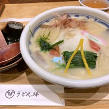 娘に連れて行ってもらったおうどん屋さんです。 白味噌仕立てで、あんこ入りのお餅がはいってました。 ちょっと不思議ですが、美味しかった😆 冬の根菜がゴロゴロ❣️ 柚子の香りもなかなかでした🤗