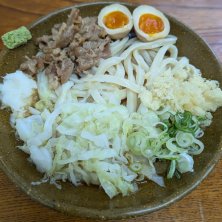 営業時間が短いんでなかなか行けなかった 人気の吉田うどんの店へ 13:25着 ちょうど受付終了の札を店員さんが出して マジでっ!と思ったけど1名なんとか入れて貰えた〜 欲ばりうどん ¥700 (肉・ちく天・ワカメ・キツネ) ちく天が品切れで肉追加してもらった。 麺は啜ると言うより噛みちぎる感じ 念願叶った 旨し!!