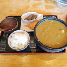カレーランチ 丼の量を見てください ライスと小鉢も付いてます 麺は伊勢うどんくらい太い手打ち麺 丼がまた大きくて深いこと! カレーは汁うどんにカレーをかける スタイルではなく オールカレールウ(~_~;) 多い 多すぎる うどんはみんなに手伝ってもらったけど 最後はライスを丼に投入して 完食しました げふ〜