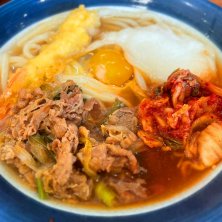スレシャルうどん。 このゴチャゴチャしたのが良いんです。 出汁にたまごも山芋もキムチも肉の甘い汁も混ざって渾然一体となり、虜になります。 因みに、写真に写っている物、佃煮が隠れて写っていませんがが、全てがセットです。