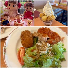 最寄りの不二家で日替わりランチ🥗 カニクリームコロッケ🦀とチキンガーリックソース、とってもおいしかったです。ドリンクバーとパフェで3時間くらい喋っていたかな。入り口のペコちゃん人形達がかわいい♡