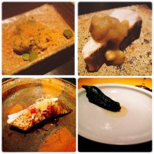 じき宮ざわ 備忘録投稿です(^^;; *子持ち鮎の蒸し物 もち米の甘みがよく合います。 あしらいは自家製のからすみ 翡翠色の銀杏の美しさと食感が印象的 *鰆の焼き物。茄子と栗のお味で *カマスは皮目だけ炙って。 握りのスタイルですが、酢飯の代わりにお茄子 *万願寺とうがらしに蛤 中に蛤を射込み、 じっくりと火を通してあります。 口に含むと小籠包のように蛤のお出汁がじゅわっと。 余白の美を感じる粋な盛り付け。 続きは後ほど…。