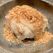 @京都で夜の御食事コースの名物焼胡麻豆腐。 蛤と卵の蒸し物 白味噌のお雑煮 金目鯛お造り 焼胡麻豆腐 答志島トロさわら炙り 金沢産金時草天ぷら 海老芋と車海老 明石産穴子とゴボウ柿乗せ 鴨葱 ごはんと香の物と味噌汁 じゃこ山椒 さがほのか 最中