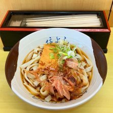 愛知県 JR名古屋駅 きしめん 住よし 玉子きしめん たっぷりの鰹節とねぎ、柔らかめだがツルツルの麺がうまい。 生玉子の黄身を少しづつ溶かしながら、麺をすする…これがまたうまい。 席に着いて一分位で提供され、時間がない時でもササッと食べられる。 安定感抜群のうまさで、満足。