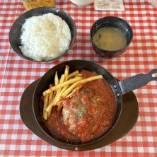 クリームソースハンバーグ小 以前から気になってたハンバーグ専門店。鉄板で提供され熱々でした。フライドポテト、ご飯、サラダ、お味噌汁付きで、小サイズの場合は780円でした。安い! たぶんこのハンバーグはクリームソースよりデミグラスソースとか焼肉ソースの方が合いそうな気がするから次回はそうします♪