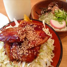 冷やしきつねうどんと小バラ丼のセット。バラ丼は十勝豚丼と似てる。キャベツ引いたのとマヨネーズ掛けるのがオリジナルか? うどんもコシがあってまずまずだが、出汁がイマイチ。