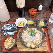 お昼は錦本店さんで日替わりの鉄板鍋焼きうどんと炊き込みご飯のセット。一番好きなんであたりです。