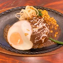 ハンバーグの店、モンブラン。六種類のソースから選べて、今回は濃くのある甘口デミグラスソースのロシア風をセレクト! 濃厚なソースたっぷりで、お肉はしっかりぎゅっと詰まっています。なかなかのボリューム!