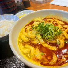 遅めのランチは辛吉カレーうどん。揚げ餅をトッピングしました!