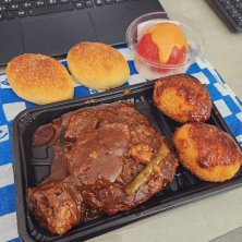 今日はお出掛けがてらエキュートでランチ調達🍱 つばグリのデリでハンブルクステーキと帆立クリームコロッケとトマトのファルシ🍅 パンは同じくエキュートのブレッドワークスの塩バターパン🫓 職場にレンジあると便利ね✨