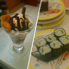 【今日の夜ご飯】 かっぱ寿司で5皿 あおさの赤だし +チョコレートパフェ 今日、「合盛り」というメニューを知りました。 「合盛り」いいですね(^^)