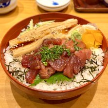 今日は銀座でランチ♪前回このお店に来たときに「次回はこれ!」と決めていたづけあなちらしです♪ この丼、上に乗っている漬け鮪と穴子はもちろん美味しいんだけど、ごはんの中にイクラ、サーモン、エビ、いか、たこ、とびっこが隠れてるんです!かなりのお得感《*≧∀≦》