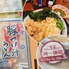 【2泊3日お仕事明けに】 ・旨辛豚つけ汁うどん 温泉玉子つき こんにちは( ´ ▽ ` )ノ まだらん、火曜日からのお仕事2泊3日明け、 月2回あるうちの1回、今日は新宿にある本社 に報告に行きました🤗 その後、食べたのがこれ!! え、1玉/1.5玉/2玉/2.5玉/3玉まで、なんと 同一価格だなんて凄っ!! もちろん、まだらんは3玉に(σ≧▽≦)σ おお、めっちゃボリューミー!そして、この くらいの旨辛なら食べれるし、美味しかった😋 さすが3玉、満足満足、めっちゃ満足😆