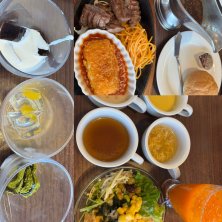 13:08 • 厚切りカットステーキ150g(ミディアム・オニオンソース)、白米120g、鶏肉としいたけのスープ150ml、サラダ(赤ドレッシング小さじ1) • PFC:460 kcal(P22.0 / F12.8 / C51.0) • 塩分:0.9 g|プリン体:約70 mg|カリウム:350 mg • 抹茶わらび餅(非常に小さめ×2個) • PFC:40 kcal(P1.6 / F0.7 / C5.3) • 塩分:0.15 g|プリン体:約10 mg|カリウム:18 mg