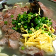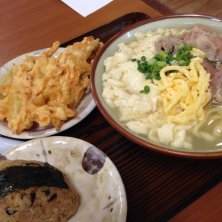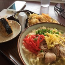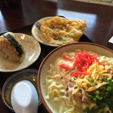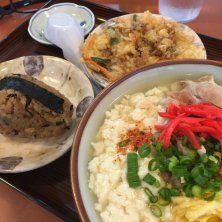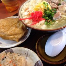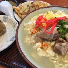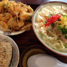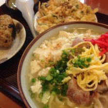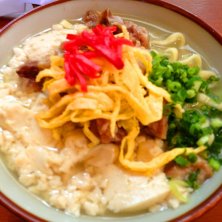 ゆしどうふそば(中)、ジューシー、イモテンプラ