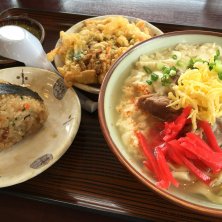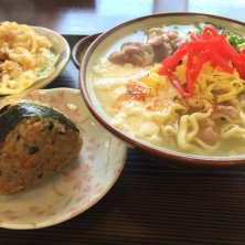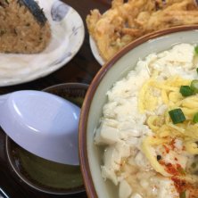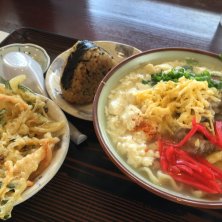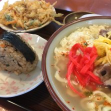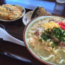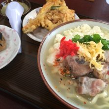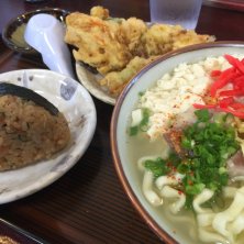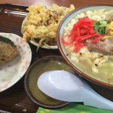 ゆしどうふそば(中)、ジューシー、ヤサイテンプラ。