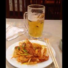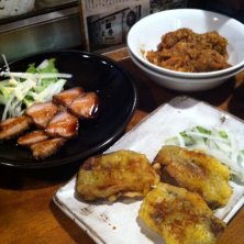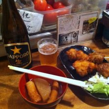 相撲見ながらイッパイやってる。 このネギチャーシューはつまみに最高。 マジ安すぎだ、この店は。