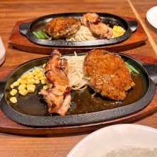 [Cコンボ(豚焼肉、目玉焼き、ハラミステーキ、ハンバーグ)] とにかくハラミが食べたいと思ったけど、ハラミ単品がなく、コンボにしか入ってなかったので「これじゃ多いんやけどなぁ」と言いながらオーダー。 結局、セットのサラダとライスも完食。ダンナにイリュージョンと言われた…(^◇^;)