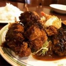 今夜は打ち上げ〜♡ …のつもりが、明日もお昼から仕事になっちゃった(T ^ T) 終業時間10分前に出張費の請求の束を30件分持って来られた(; ̄ェ ̄) バカやろ〜❗️(☄ฺ◣д◢)☄ 仕事を理由に、大掃除はサボっちゃおう(≧∇≦)←そっちか⁉︎(笑) てことで、明日の朝だけでもゆっくり寝て、お昼から伝票作るの頑張りますʅ(◞‸◟ა)ʃ。 このプレート、まっ茶っ茶やけど、手前からハンバーグ、エビフライ、串カツです。 大盛りでかんぱーい(≧∇≦)