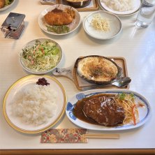 今日のランチ♪ ぷらぷら歩いてご近所の洋食屋さんで お昼ごはん(*゚~゚*)モグ モグ 和やか~な雰囲気のご夫婦がされてるこじんまりとして居心地のいいレストラン。 ゆったりとした休日の午後にピッタリのお店です。 メインが2種類選べるので ハンバーグとクリームコロッケ♡ 大好きな組み合わせ♡♡♡ おみそ汁もとっても美味しかった(๑❛ᴗ❛๑)♡