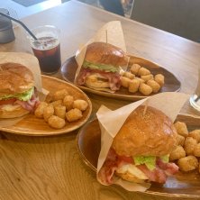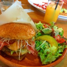 白味噌チーズバーガー♡ 近江牛パティのハンバーガー♪( ´▽`)ふわふわバンズと甘辛い白味噌・チーズのコンビめっちゃ美味しい♡(о´∀`о) 後ろに見切れてるのは4人前の巨大バーガー☆3月誕生日の友達3人へのサプライズプレゼント٩( ᐛ )و笑