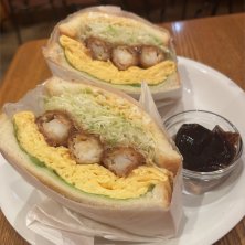 ポテサラ入りのエビフライサンドは売り切れのため、オムレツ入りのエビたまサンドを注文。ボリュームもあって見た目は良いけど、サンドイッチにエビフライはちょっと弱く感じました。ヒレカツサンドに勝てないかな。 エビたまサンド 1,300円