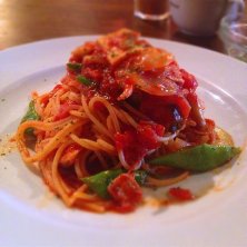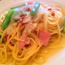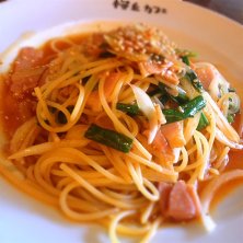 本日のランチは、ベーコンとキノコ、インゲンのトマトソーススパゲティ。ナポリタン的な味わい、うまし\(^o^)/
