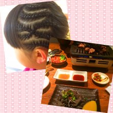 本番に備えて♫ 会社終わって、じじのタクシーで娘を会社まで連れて来てもらい、明日のイベントのために美容院へ★ コーンロウ♡ いつもはハートにしてるんですが、今回はクロスに(^_^) 娘も気に入ったようです♡ 昔の私はこんな頭でしたw そして相方さんと合流し、うちの近所の焼肉屋へ! 安くて美味しい(●'w'●) 大好きなセンマイ刺し♡ 美味しかったー♡