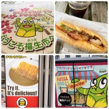 日帰り福生散歩🐾② 福生のゆるキャラ「たっけー」が駅でお出迎えしてくれました。 お昼はご当地グルメの福生ドッグ。 ▶︎地元ハムメーカーのソーセージを使うこと ▶︎ソーセージの太さは23mm=ふっさ(23)の語呂合わせ😆 が条件らしいです。 CoCo壱も英語でデリシャス!