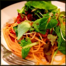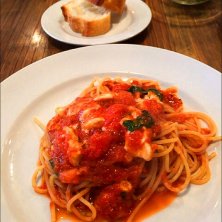 初投稿!トマトとモッツァレラのパスタ 800円 バゲット サラダ付き 美味しいし満足できる量です♪ 落ち着いた雰囲気の中食べるパスタは最高でした。 とってもお洒落なカフェ!