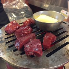 厚切りのレバー 器には、にんにく、バターが入っていて、これを炙って溶かし、レバーに付けていただきます。 その後、器に卵を入れ焼きます。 焼けたらかき混ぜ、スクランブルエッグのうようにしていただきます!