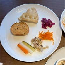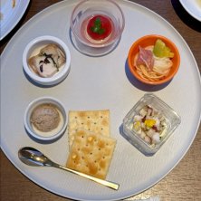 時計回りに トマトの甘酢漬け アボカド&ハーブの豆乳ソースの冷製パスタ タコと帆立、茗荷のさっぱりマリネ 江津産まる姫ポークのリエット(クラッカー添え 大山どり胸肉のカレー風味テリーヌ
