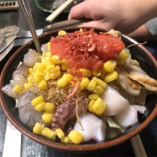 東京都の月島と浅草に有るもんじゃ焼き、お好み焼きと鉄板焼きの店、もんじゃ まぐろ家の坂井スペシャルの鮪トッピング。しっかりと味付けをした特製秘伝の出汁の中に銀座の天ぷらの名店、天ぷら近藤の天かす、明太子、烏賊、蛸、帆立、海老、コーン、キャベツに鮪を追加し、オーナーのこだわりのオススメのもんじゃ焼き。ここは鮪のもんじゃ焼きが食べられると聞いたので、鮪も追加してもらった。魚介類は豊洲市場で厳選された食材を使用している。色々な魚介類が贅沢に味わえる満足出来る味であった。やっぱりもんじゃは海鮮が1番。