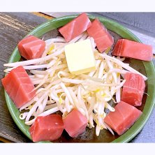 "鉄板焼き"のおつまみから "バター焼きシリーズ"で 看板料理のひとつ "まぐろバター焼き" 近くにある豊洲市場で厳選された "まぐろ"を"もやし"と一緒に バターで炒めて 軽く醤油で味付け "まぐろ"の外側は焼き色で白く変わるけど 身には熱を入れつつも ほんのり温かいレア気味状態で頂いたら いい感じ