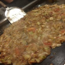 "お好み焼き"は 広島風というべき "定番豚そば" まずは"そば"と お好み焼きを 別々に調理して お好み焼きの半面が焼けてきたら ドッキングして完成 ソースとマヨネーズを塗って 踊る"花鰹ちゃん"をライドオンさせて "青のり"ふったら最高