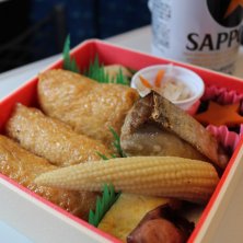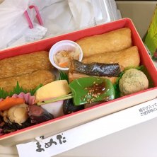 いなり弁当 豆狸のいなりにだし巻きたまごや鮭、とりのやきもの、椎茸煮、あん入り団子など。 つけ合わせが、とてもやさしい味で美味しい。 丁寧につくられているように思えるお弁当。 小生にとって間違いない弁当!その2入り。 その1は今半、牛玉弁当。