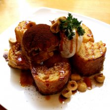 今日のおやつ フレンチトーストとドリンクセット ¥1.200 林檎のコンフィ?とアイス&生クリーム❤️ バゲットもしみしみでSサイズだけど大満足〜♪ 友達のかぼちゃのプリンも美味しそうだった^ - ^