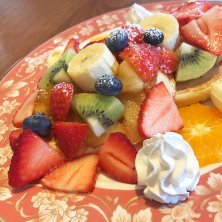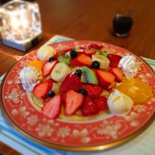 先日…紅茶と パンケーキが とってもおいしい⁽(◍˃̵͈̑ᴗ˂̵͈̑)♡♡と聞いていた お店におじゃましてきました⋆⑅*॰¨̮❤︎❤︎ パンケーキ2枚の上に… フルーツもりもり⤴︎⤴︎⋆⑅*॰¨̮❤︎ いちご・バナナ・オレンジ・ブルーベリー・煮りんご、クリームが てんこもりもり(((o(*゚▽゚*)o)))❤︎❤︎ かな〜り食べ応えのある…♬ フルーツの世界に迷いこんだような(*´艸`*)笑♪ ものすごくおいしい フルーツパンケーキでした✡。:* 見た目も すっごくかわいかったです♡♡