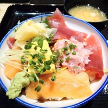 "マグロ"と"サーモン"に"ねぎトロ・玉子" 具材の下の酢飯には "錦糸卵"に"かんぴょう・でんぶ"が 潜んでいて 食べ応えありの "おまかせ海鮮丼" これで1200円というのが 何よりありがたing 美味しくいただきました